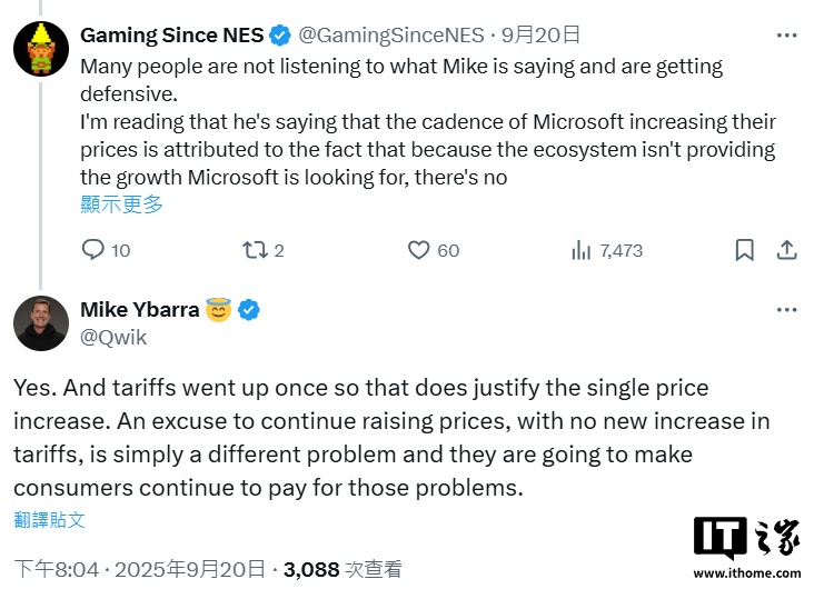 后续 Mike 在回复玩家观点时表示,Xbox 今年第一次涨价确实是有“关税方面的原因”,本次涨价完全是另一种原因,微软只是让消费者继续为这些问题买单,而关税就被当成了“持续涨价的借口”。