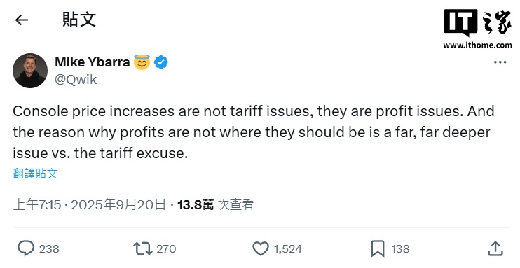 IT之家 9 月 23 日消息正规炒股在线配资网,前暴雪娱乐总裁 Mike Ybarra 今天在 X 平台发文,聊及微软 Xbox 游戏机的涨价政策。