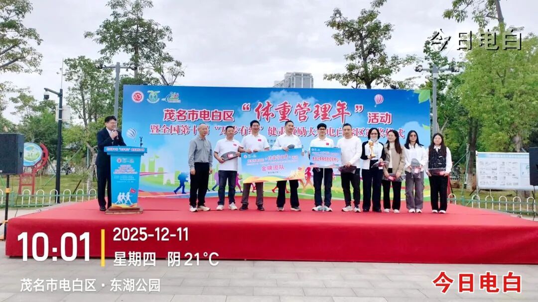 12月11日,全国第十届“万步有约”健走激励大赛电白赛区颁奖仪式暨全民健康生活方式环湖健走活动在水东街道东湖冼太广场举行,现场为大赛获奖个人与团队进行颁奖。区政府办、区卫健局、区慢性病防治中心等相关单位领导出席活动。
