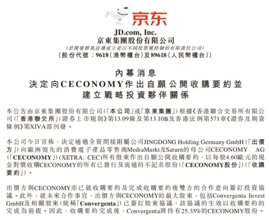 据悉,Kellerhals家族通过Convergenta平台继续持有近25%的股份,其余主要股东承诺将约32%的股份出售给京东。也就是说,在监管审批完成后,京东将直接进入Ceconomy的核心股东层。