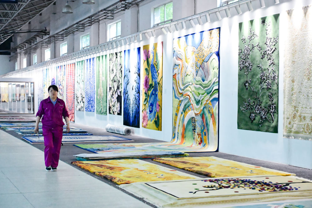 7月21日,圣源地毯集团有限公司车间内展示的各类挂毯。新华社记者 齐芷玥 摄